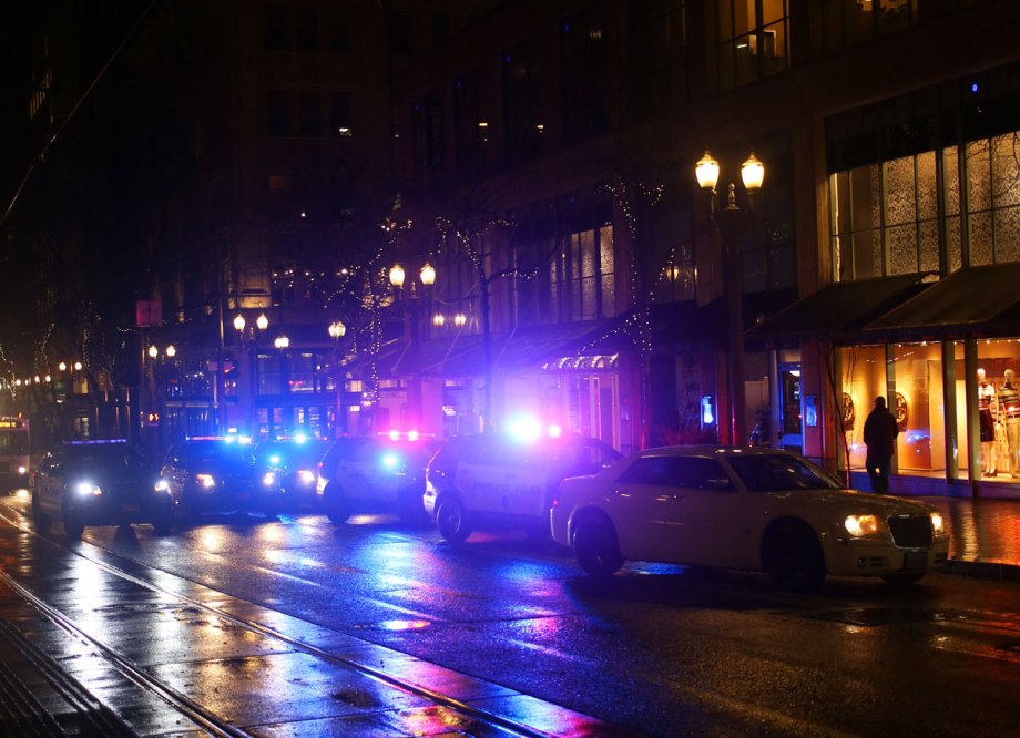 A lot of Portland police cars with lights flashing in front of Pioneer Place mall downtown when I left work. No idea what it was about.