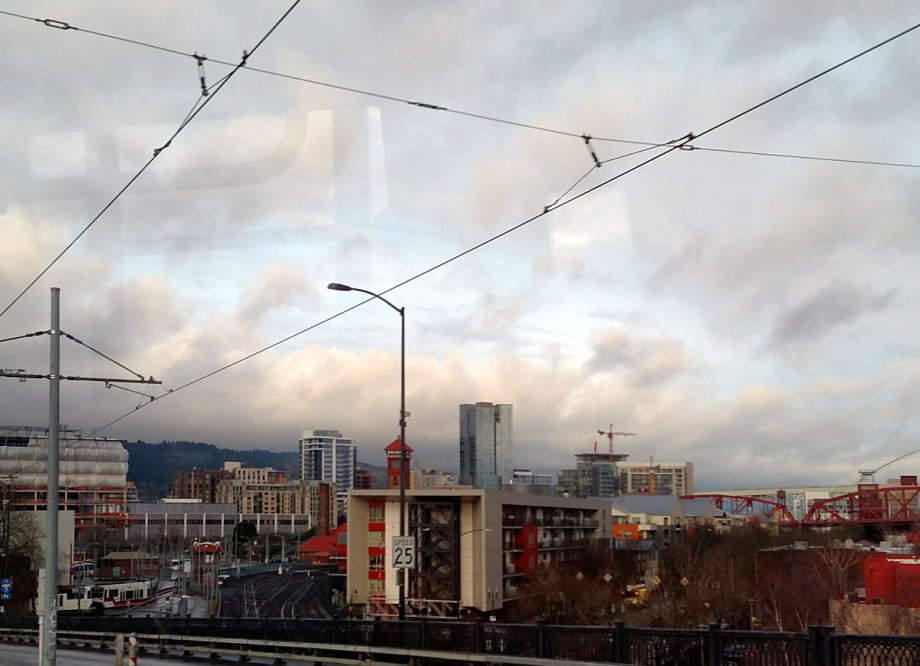 After two days of jury duty, finally back to work. This was taken from the MAX train while crossing the Steel Bridge into Old Town/China Town. I like the geometry of all of that light rail train line wiring.