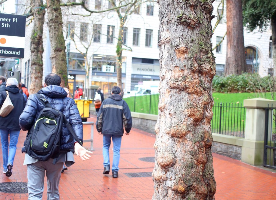 The commuters rushing to work at Pioneer Courthouse Square in downtown Portland.